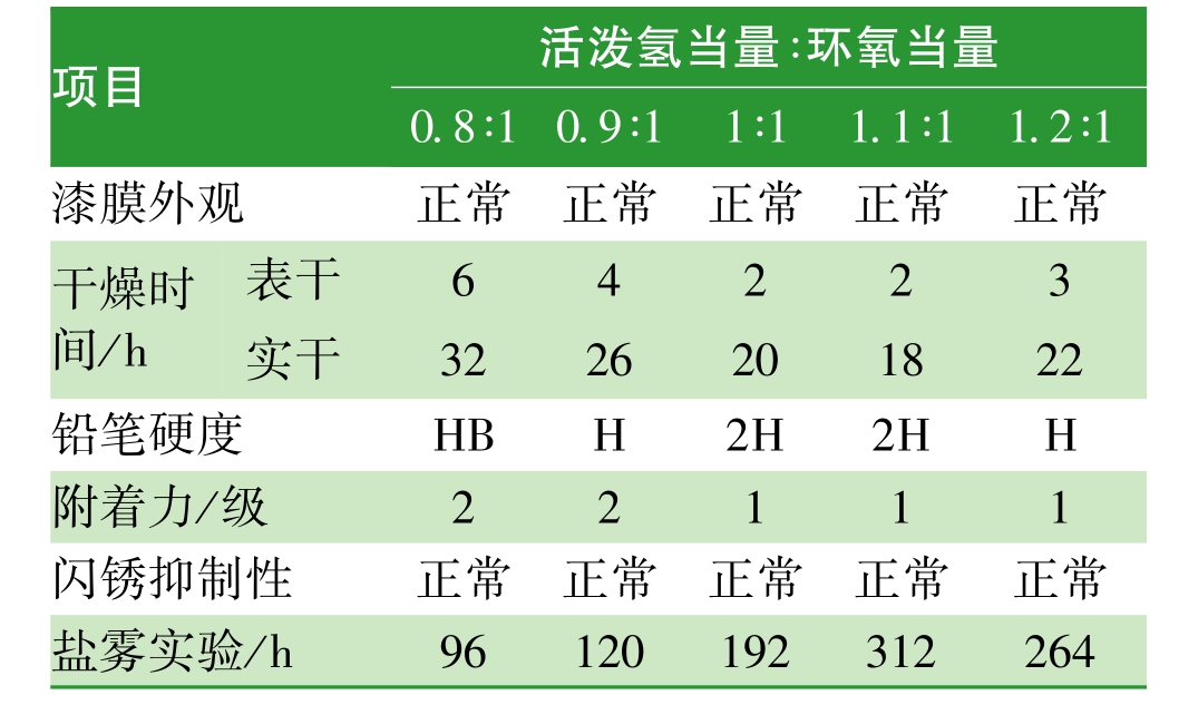 由表2所知,当活泼氢当量与环氧当量比为0.8∶1~1.1∶1时,随着固化剂用量的增加,漆膜的干燥时间降低、硬度增加、附着力提高、防腐性能增加。这是由于随着固化剂用量的增加,在漆膜固化过程中胺基含量越多,与环氧基反应速度越快,反应体系的固化交联更加完全,漆膜的性能随之提高。继续增加固化剂用量,漆膜中存在未完全固化的固化剂,导致漆膜的性能有所下降。所以活泼氢当量与环氧当量 配比为1.1∶1。在活泼氢当量与环氧当量 配比为1.1∶1条件下,对漆膜进行耐水性(240 h)、耐酸性(50 g/L,H2SO4,24 h)、耐碱性(50 g/L,NaOH,240 h)性能测试,实验结果表明在该条件下制备的漆膜耐水、耐酸碱性能较好,未出现起泡、剥落、生锈现象。