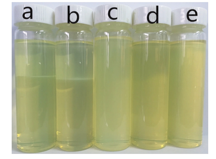a—n(AGE) ∶n(PGE)=1∶9;b—n(AGE) ∶n(PGE)=2 ∶8;c—n(AGE) ∶n(PGE)=3∶7;d—n(AGE) ∶n(PGE)=4 ∶6;e—n(AGE) ∶n(PGE)=5∶5