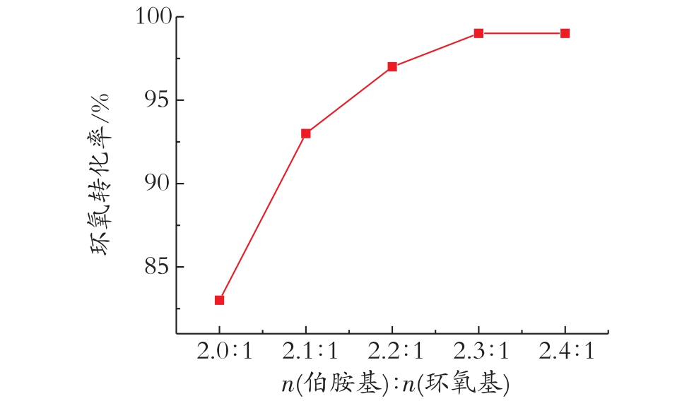 由图1可以看出,随着反应物料物质的量比增加环氧转化率增加。当n(伯胺基)∶n(环氧基)≥2.3∶1时,环氧基的转化率达到98%,且基本保持不变。当 n(伯胺基)∶n(环氧基)≤2∶1时,环氧基与伯胺反应生成仲胺后,随着反应进行,继续与仲胺发生反应,且极易发生凝胶。