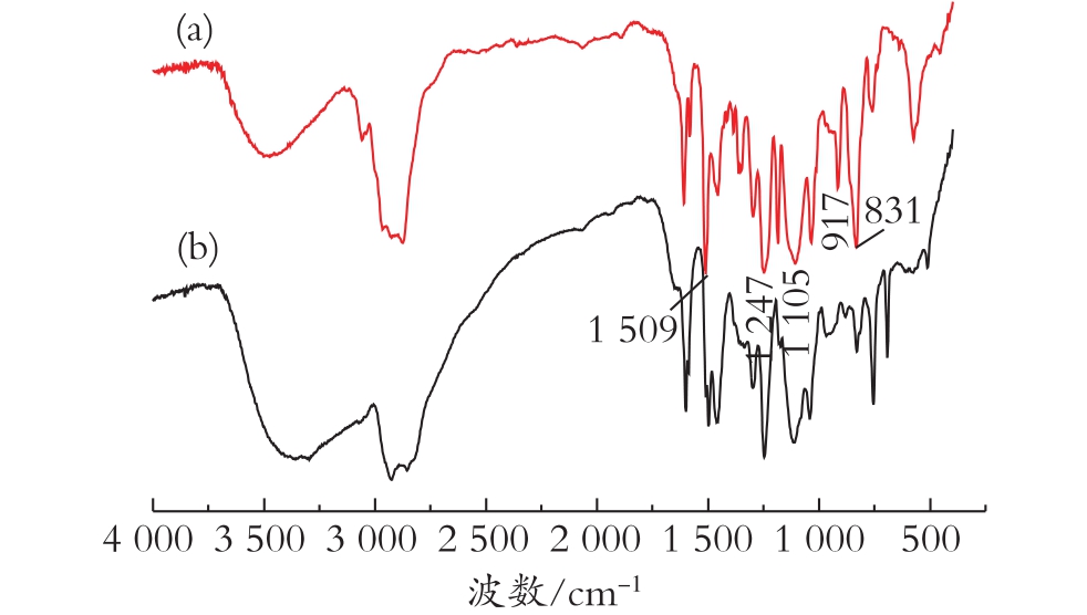 从图5(b)可以看出,合成的产物的红外光谱中1 509 cm-1、831 cm-1处出现双酚 A 结构中苯环对位取代吸收峰;1 247 cm-1处出现芳香族醚氧键伸缩振动吸收峰;1 105 cm-1处出现聚醚C—O—C的吸收峰,说明原料中的环氧树脂结构及PGGE中的聚醚链段引入到产物分子结构中。另外,917 cm-1处环氧基的吸收峰消失,说明原料中环氧基和单环氧封端剂中的环氧基团均发生了开环反应。
