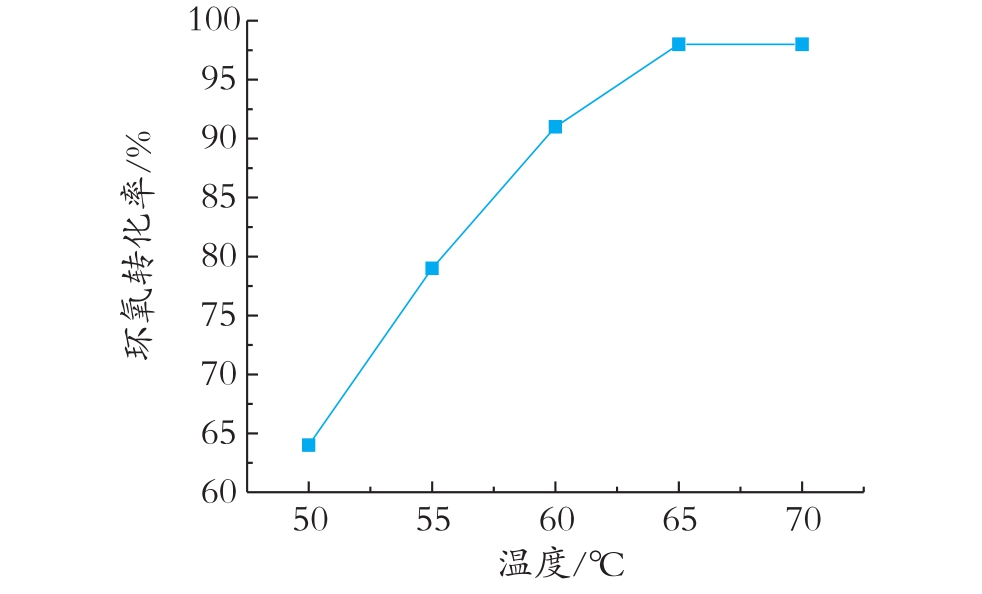 由图2可以看出,环氧转化率随着初始反应温度的增加而增加,当初始反应温度为65℃时,环氧转化率为98%。当初始反应温度大于70℃时,由于环氧基与伯胺基反应放热,使反应温度持续升高,极易产生副反应,发生凝胶。